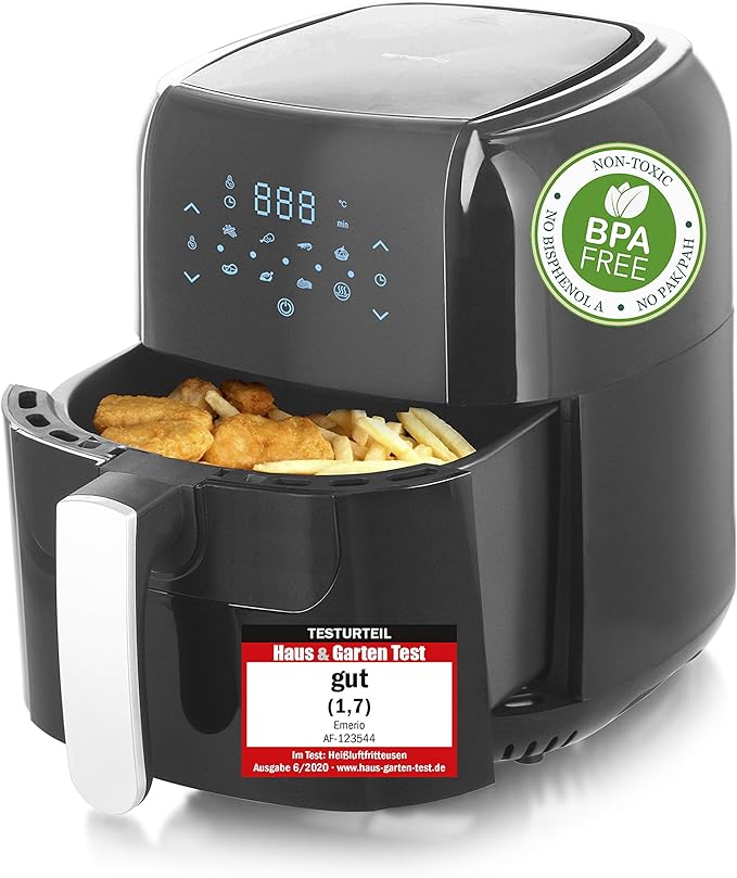Die Emerio Fritteuse ist das perfekte Küchengerät für alle, die gerne frittieren. Mit einem großen Fassungsvermögen von 5,5 Litern kann sie bis zu 750 g Pommes frites auf einmal zubereiten. Dank des Cool-Touch-Gehäuses musst du dir keine Sorgen machen, dass die Außenseite der Fritteuse heiß wird. Das Touch-Display mit 7 vorinstallierten Programmen und dem Warmhaltemodus macht die Bedienung einfach. Das schnelle Aufheizen bedeutet, dass du nicht vorheizen musst, und das spülmaschinenfeste Design macht die Reinigung zum Kinderspiel. Mit der 6-in-1-Funktionalität kannst du in einem einzigen Gerät braten, grillen, backen, schmoren, köcheln und aufwärmen.